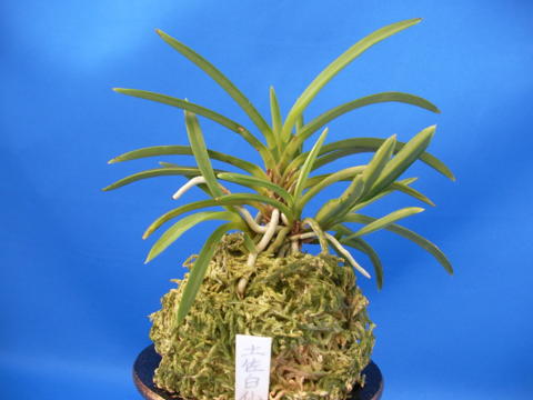 15年前に10本立ちの中に1本のみに墨らしき縞があり、選別し大切にしていたところ、細葉の先が燕尾で、墨と紺・黄縞を流し、新葉が白い曙虎で出るようになった。最近は子にも墨と紺縞に黄縞も入り、その芸は引き継がれている。根もルビー根が交ざることもある。仮名を土佐白仙(とさはくせん)とつけ楽しんでいる品種で、小子に羆芸が出ており、将来に期待がもてます。